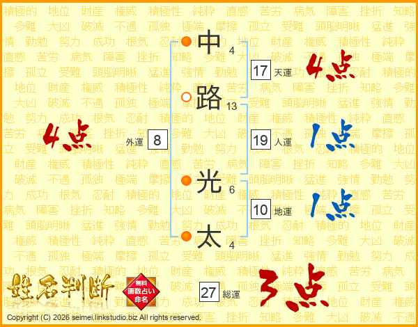 性格や才能などを表す2番目に重要な運勢です。人間関係や協調性、社会的な成功に影響します。主に20歳から50歳ぐらいまでの中年期の運勢を表します。苗字の下1文字と、名前の上1文字の合計画数。