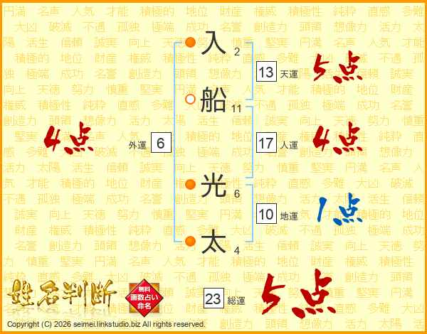 生活面を象徴する運勢です。外部から受ける影響力を表し、結婚運、家庭運や職場、環境への順応性を表します。総運から人運を引いた画数。姓や名が1文字の場合を除く。