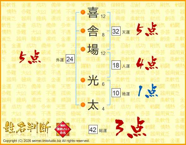 喜(12画)舎(8画)場(12画) 光(6画)太(4画)