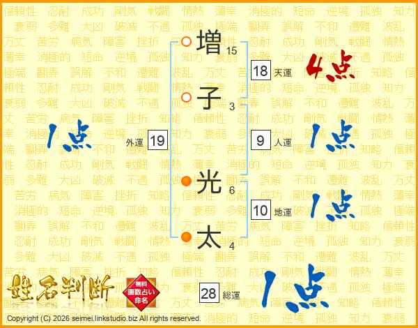 あなたの人生を表す1番重要な運勢です。生涯を通じて影響する総合運となり、主に50歳以降の晩年期に影響を及ぼします。苗字と名前の合計画数。