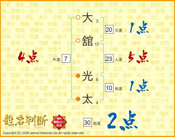 あなたの人生を表す1番重要な運勢です。生涯を通じて影響する総合運となり、主に50歳以降の晩年期に影響を及ぼします。苗字と名前の合計画数。