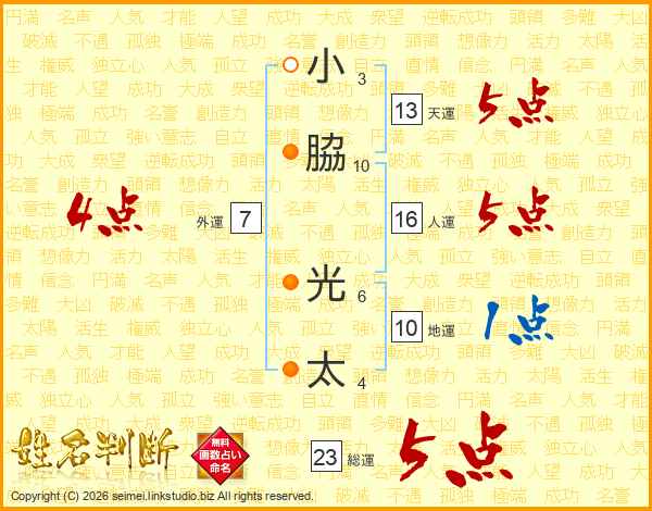 生活面を象徴する運勢です。外部から受ける影響力を表し、結婚運、家庭運や職場、環境への順応性を表します。総運から人運を引いた画数。姓や名が1文字の場合を除く。