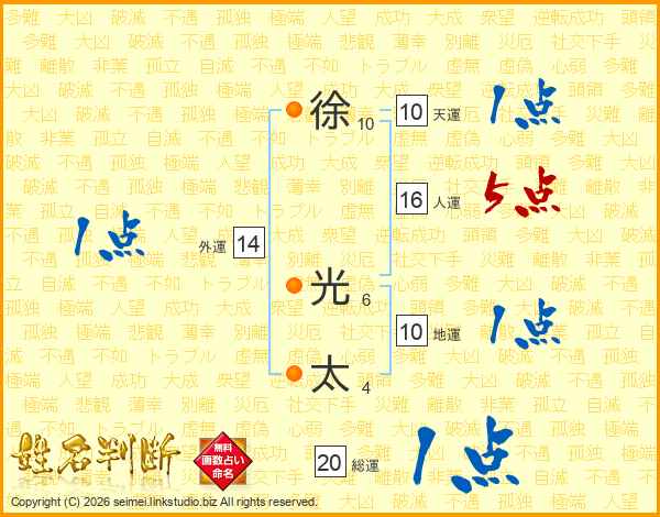 生活面を象徴する運勢です。外部から受ける影響力を表し、結婚運、家庭運や職場、環境への順応性を表します。総運から人運を引いた画数。姓や名が1文字の場合を除く。