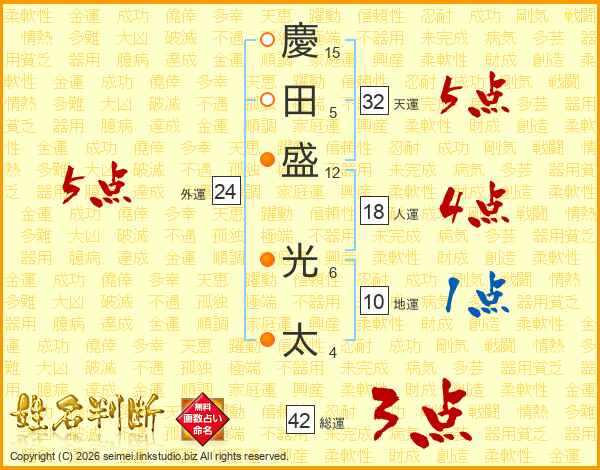 慶(15画)田(5画)盛(12画) 光(6画)太(4画)