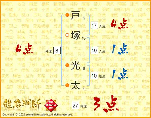 戸(4画)塚(13画) 光(6画)太(4画)