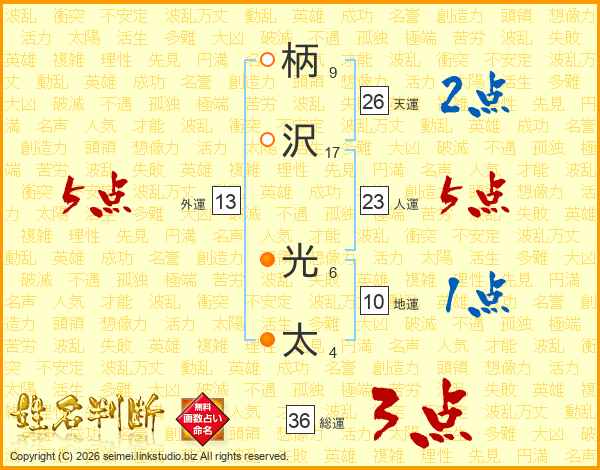 柄沢光太さんの天運は26画の2点!