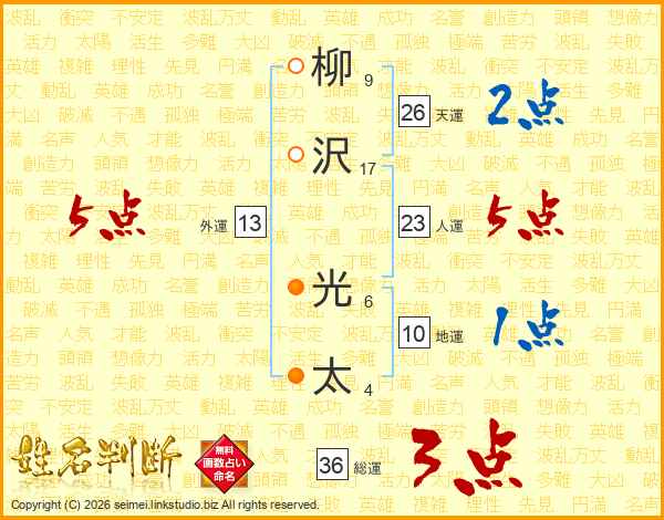 柳(9画)沢(17画) 光(6画)太(4画)