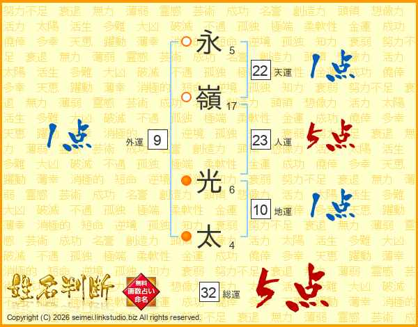生活面を象徴する運勢です。外部から受ける影響力を表し、結婚運、家庭運や職場、環境への順応性を表します。総運から人運を引いた画数。姓や名が1文字の場合を除く。