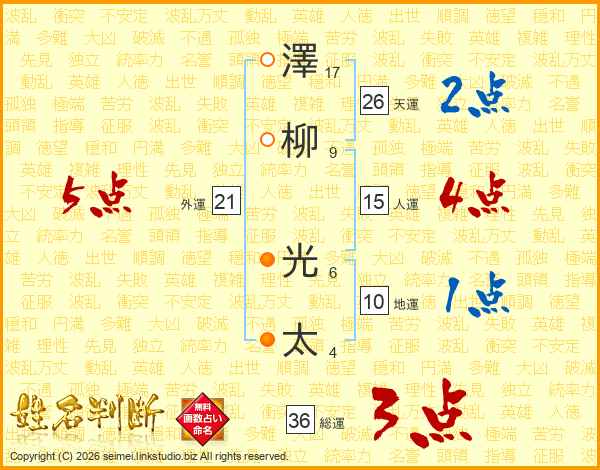 澤(17画)柳(9画) 光(6画)太(4画)