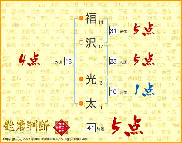 福沢光太さんの総運は41画の5点!