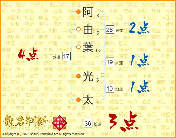 阿(8画)由(5画)葉(13画) 光(6画)太(4画)