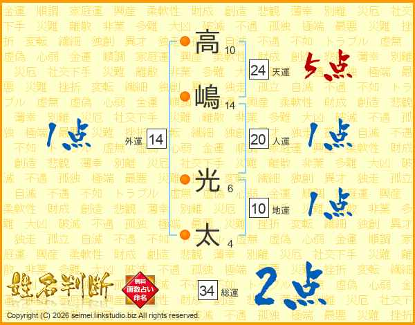高(10画)嶋(14画) 光(6画)太(4画)