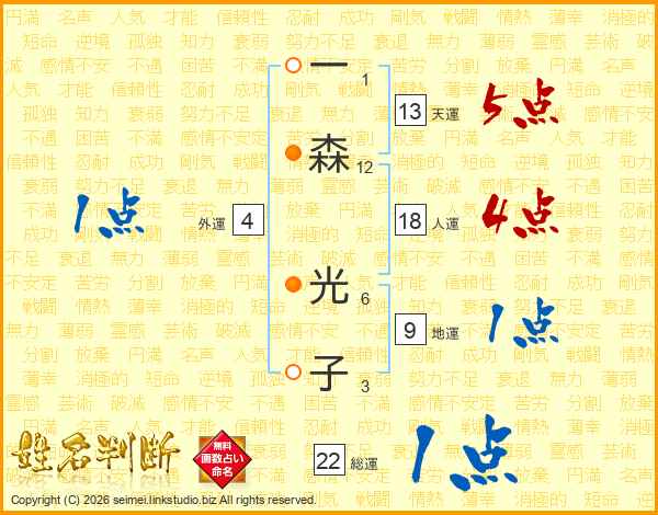 生活面を象徴する運勢です。外部から受ける影響力を表し、結婚運、家庭運や職場、環境への順応性を表します。総運から人運を引いた画数。姓や名が1文字の場合を除く。