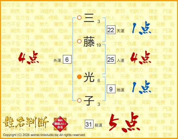 生活面を象徴する運勢です。外部から受ける影響力を表し、結婚運、家庭運や職場、環境への順応性を表します。総運から人運を引いた画数。姓や名が1文字の場合を除く。