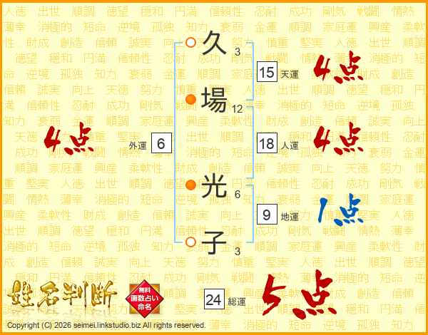 生活面を象徴する運勢です。外部から受ける影響力を表し、結婚運、家庭運や職場、環境への順応性を表します。総運から人運を引いた画数。姓や名が1文字の場合を除く。