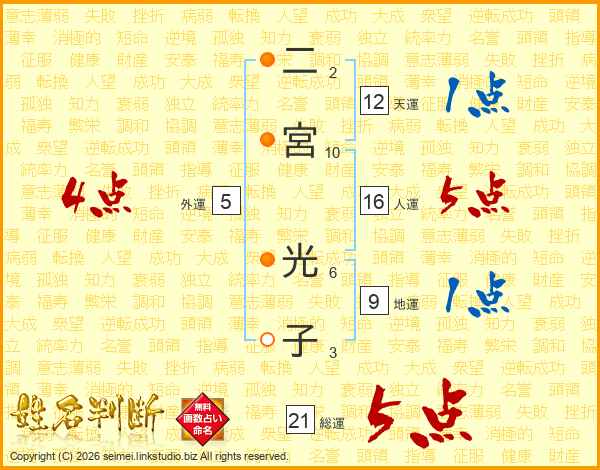 二宮光子さんの総運は21画の5点!
