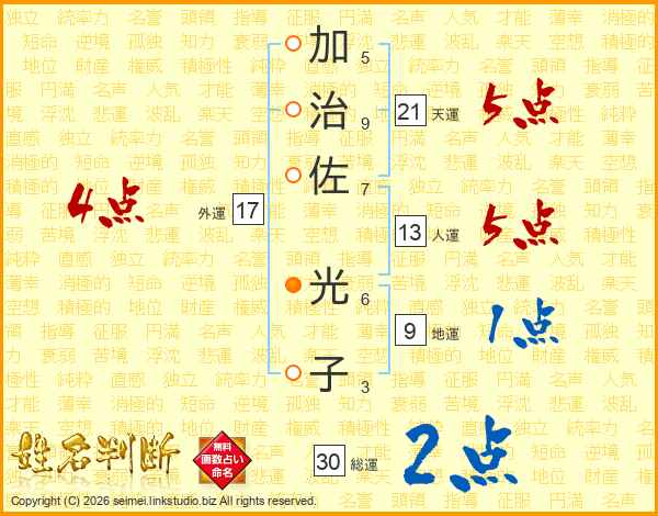 加(5画)治(9画)佐(7画) 光(6画)子(3画)
