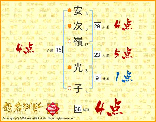 安(6画)次(6画)嶺(17画) 光(6画)子(3画)