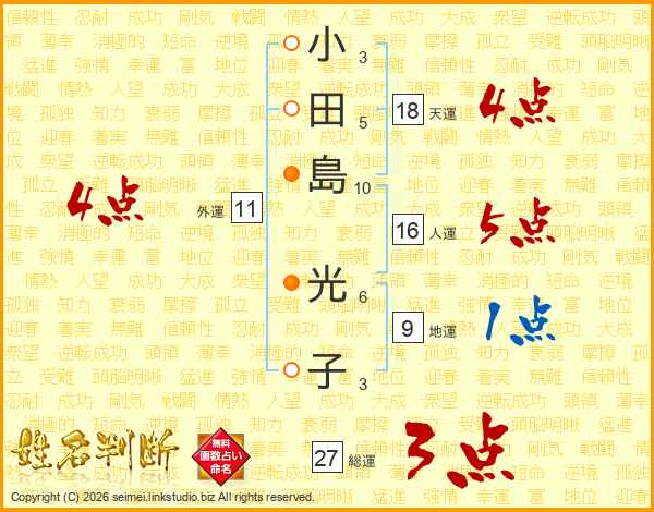 小(3画)田(5画)島(10画) 光(6画)子(3画)