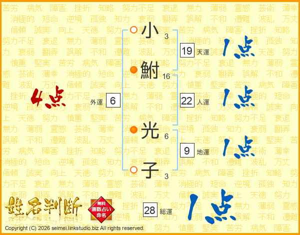 画数の奇数(○陽)と偶数(●陰)の配列で吉凶を占います。どちらかにかたよる名前は大凶名で避ける必要があります。画数の奇数偶数。