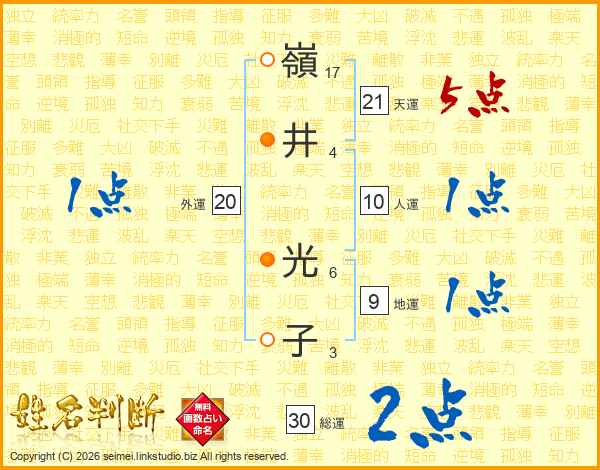 生活面を象徴する運勢です。外部から受ける影響力を表し、結婚運、家庭運や職場、環境への順応性を表します。総運から人運を引いた画数。姓や名が1文字の場合を除く。