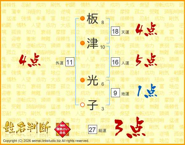 あなたの人生を表す1番重要な運勢です。生涯を通じて影響する総合運となり、主に50歳以降の晩年期に影響を及ぼします。苗字と名前の合計画数。