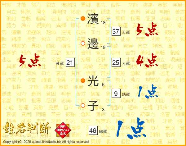 生活面を象徴する運勢です。外部から受ける影響力を表し、結婚運、家庭運や職場、環境への順応性を表します。総運から人運を引いた画数。姓や名が1文字の場合を除く。