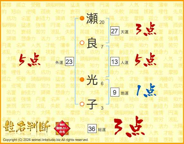 瀬(20画)良(7画) 光(6画)子(3画)