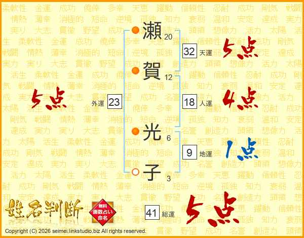 瀬(20画)賀(12画) 光(6画)子(3画)