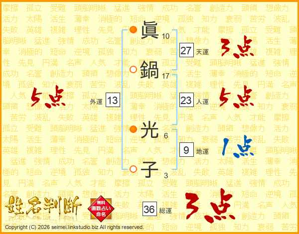 眞(10画)鍋(17画) 光(6画)子(3画)
