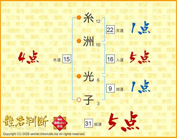 生活面を象徴する運勢です。外部から受ける影響力を表し、結婚運、家庭運や職場、環境への順応性を表します。総運から人運を引いた画数。姓や名が1文字の場合を除く。