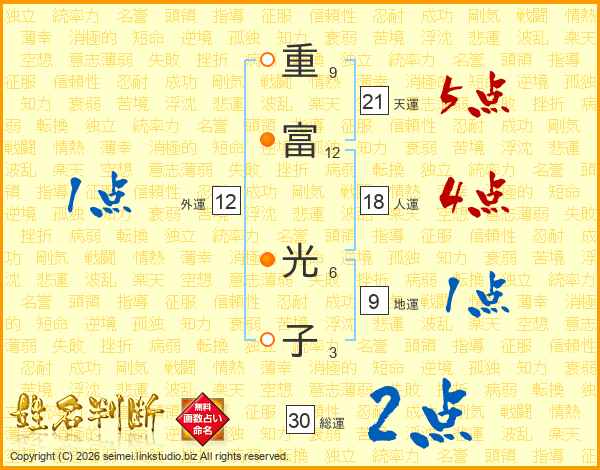 重(9画)富(12画) 光(6画)子(3画)