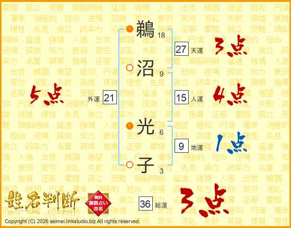 鵜(18画)沼(9画) 光(6画)子(3画)