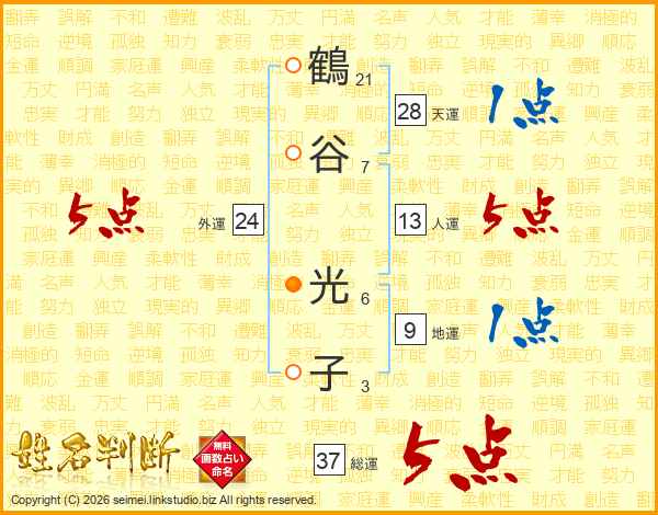 鶴(21画)谷(7画) 光(6画)子(3画)