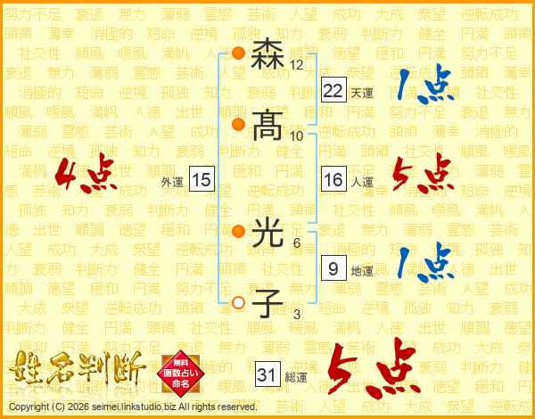 あなたの人生を表す1番重要な運勢です。生涯を通じて影響する総合運となり、主に50歳以降の晩年期に影響を及ぼします。苗字と名前の合計画数。