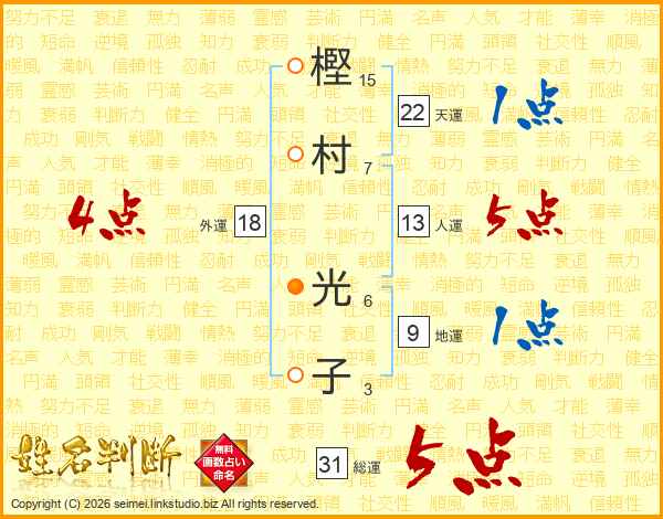 あなたの人生を表す1番重要な運勢です。生涯を通じて影響する総合運となり、主に50歳以降の晩年期に影響を及ぼします。苗字と名前の合計画数。