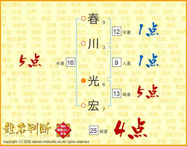 あなたの人生を表す1番重要な運勢です。生涯を通じて影響する総合運となり、主に50歳以降の晩年期に影響を及ぼします。苗字と名前の合計画数。