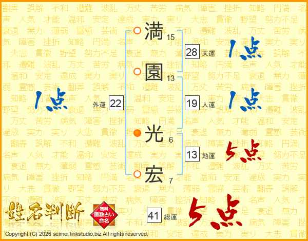 満(15画)園(13画) 光(6画)宏(7画)
