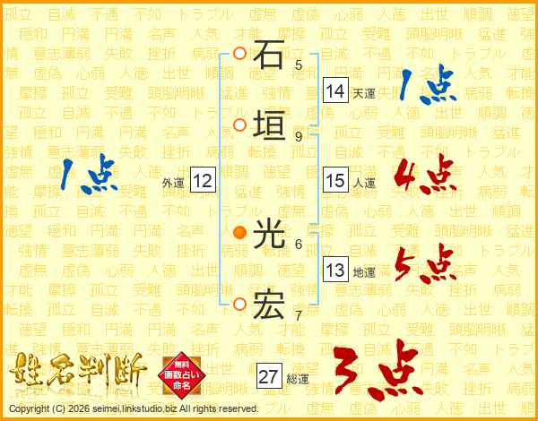 石(5画)垣(9画) 光(6画)宏(7画)