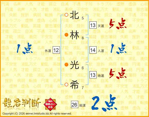 北(5画)林(8画) 光(6画)希(7画)