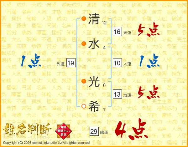 清(12画)水(4画) 光(6画)希(7画)