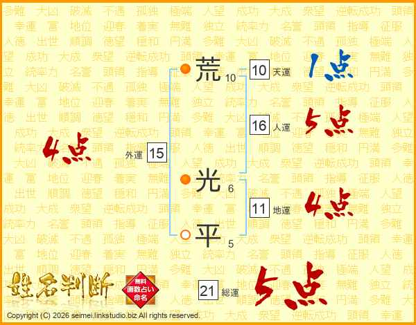 あなたの人生を表す1番重要な運勢です。生涯を通じて影響する総合運となり、主に50歳以降の晩年期に影響を及ぼします。苗字と名前の合計画数。