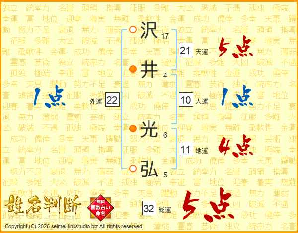 沢(17画)井(4画) 光(6画)弘(5画)