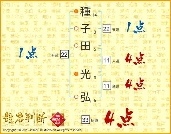 種(14画)子(3画)田(5画) 光(6画)弘(5画)