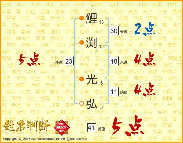 鯉(18画)渕(12画) 光(6画)弘(5画)