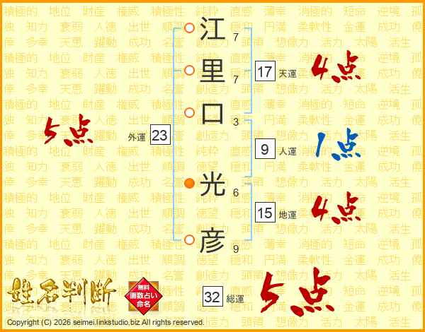 江(7画)里(7画)口(3画) 光(6画)彦(9画)