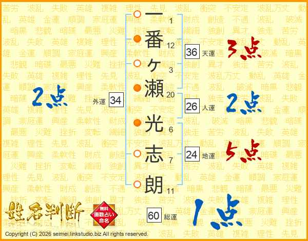 一(1画)番(12画)ヶ(3画)瀬(20画) 光(6画)志(7画)朗(11画)