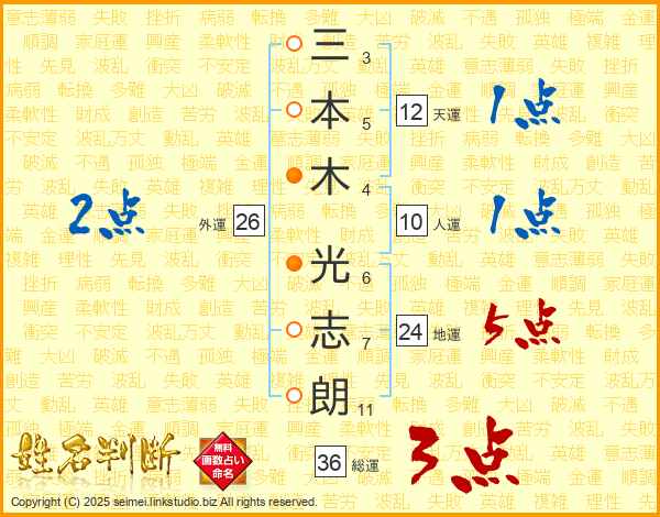 三(3画)本(5画)木(4画) 光(6画)志(7画)朗(11画)