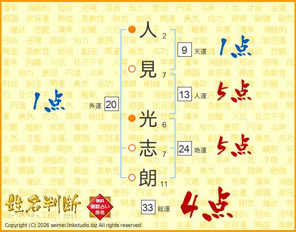 人(2画)見(7画) 光(6画)志(7画)朗(11画)