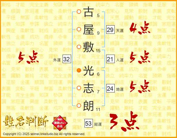 古(5画)屋(9画)敷(15画) 光(6画)志(7画)朗(11画)